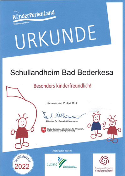 Die TourismusMarketing Niedersachsen GmbH hat gemeinsam mit dem Land Niedersachsen das Qualitätssiegel „KinderFerienLand“ entwickelt. Ausgezeichnet werden Betriebe, die besonders kinder- und familienfreundliche Ausstattungsmerkmale, Serviceleistungen und Sicherheitsaspekte aufweisen und somit auch auf die kleinen Gäste eingestellt sind.